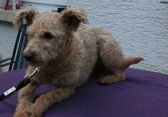 Poldi ist eine bezaubernde Pudel-Mix-Dame mit ca. 41cm und 11,5kg. Geboren ist sie etwa 03/2011. Sie wurde in sehr vernachlässigtem Zustand aufgegriffen, dass Fell lang und verfilzt. Nun wurde sie gebadet und geschoren und man sieht, welch Schönheit dabei heraus kam! Ihre schwarzen Locken bringen ihre schönen gold-braunen Augen so richtig zur Geltung. Und so lieb, wie sie mit diesen Augen schauen kann, ist sie auch. Sie ist nur nett und absolut unkompliziert, verträgt sich mit allem und jedem, geht freundlich auf jeden Menschen zu und freut sich über jede noch so kurze Streicheleinheit. Dazu ist sie auch stubenrein, kann (derzeit mit anderen Hunden) alleine bleiben, fährt gut im Auto mit, geht super an der Leine und ist katzenverträglich. Sicherlich ist diese verschmuste und verspielte Hündin auch gut für Hundeanfänger geeignet. Natürlich ist Poldi auch geimpft, gechipt, entwurmt und kastriert.